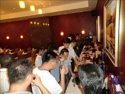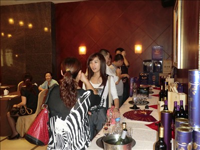 下午的会议开始前,各地客商在会场品酒区品尝东方紫美酒。
