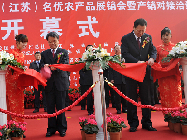 [中华全国供销合作总社党组书记、理事会主任杨传堂,江苏省委副书记、省长李学勇共同为农展会开幕剪彩]