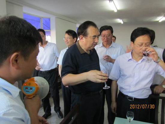 [ (左)周晓杰经理为领导介绍情况。(中)省人大常委会副主任丁解民(右)句容市市长尹卫东品尝新型紫酒]