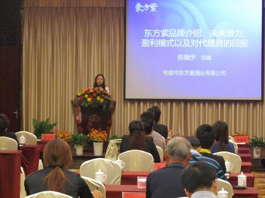 在接下来的会议中,陈总对东方紫品牌介绍、未来潜力盈利模式以及对代理商的回报进行讲解。