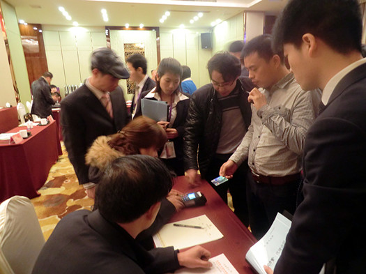 东方紫区域代理签约开始后,签约代理商纷纷来到签约台前,与高董事长和陈总裁签署自己中意的区域。并在财务台前排队缴纳合同首付款,签约会现场热烈而愉悦。