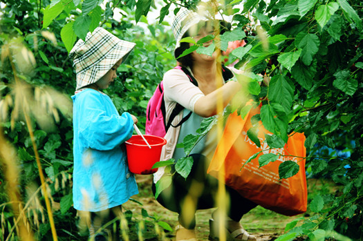 浓浓亲情,甜甜喜悦,小朋友在妈妈陪伴下采摘桑椹。认真的表情,可爱的神态,是被美丽的桑果吸引的吗?
