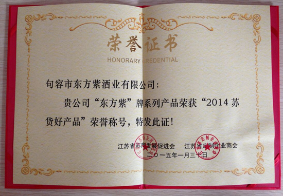 “东方紫”系列产品荣获江苏省苏商发展促进会、江苏省定制企业商会联合颁发的的“2014苏货好产品”荣誉称号。