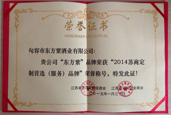“东方紫”系列产品荣获江苏省苏商发展促进会、江苏省定制企业商会联合颁发的的“2014苏商定制首选(服务)品牌”荣誉称号。