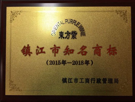 句容市东方紫酒业有限公司的“东方紫”商标,被江苏省镇江市工商行政管理局评定为,2015-2018年度《镇江市知名商标》,并颁发荣誉牌匾。