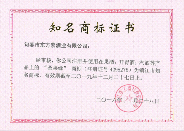东方紫酒业“桑菓缘”商标被持续评为镇江市知名商标