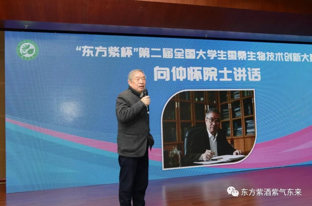 中国工程院院士向仲怀教授为荣获特等奖的学生颁奖并讲话。在讲话中,向仲怀院士对大赛的成功举办表示热烈祝贺,高度评价了此次大赛参赛选手的优秀表现,认为大赛展示了蚕业科学前进方向,是增强大学生创新意识、弘扬创新精神、促进学术交流、培养创新人才的重要平台,对蚕桑生物技术专业的未来发展将产生积极影响。向院士表示,现在中国的蚕业科学在研究基础、研究力量、研究条件、资源配置上都已经有了很大改善,一代人有一代人的责任担当,希望大家珍惜当下,努力奋斗,不断创造蚕业科学更加美好的未来。