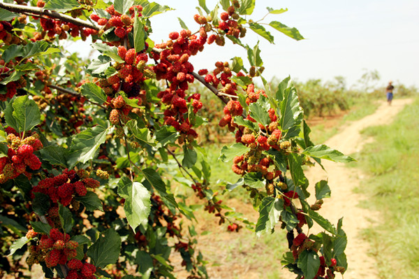 这片面积广大的桑椹园就是东方紫酒在句容的原料产区。他们的名字叫做“桑果1号”12年前从台湾迁徙到句容安家落户,他们或许没有其他品种的桑椹树那样有着高大的身材、雄壮的身形,但他们那娇小的身躯上所孕育的那累累的果实就让他独树一帜。这些桑椹树在句容福地的阳光雨水的滋润下,现在已经结出了桑椹,青的、红的、紫的,一串串的挂在桑椹树那细小的树枝上,让人担心那树枝会不会被压断。就连那刚置入土中的树苗都不让老树专美于前,也在那稚嫩的身躯上挂上了一棵棵饱满的桑椹,在路边吸引着游人的目光。
